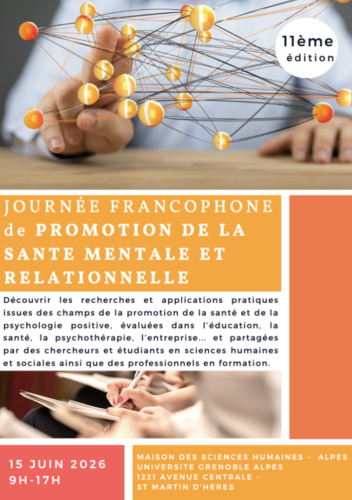 L’objectif de cette journée est de partager et de découvrir les recherches et applications issues des champs de la promotion de la santé et de la psychologie positive. Ce sera également l’occasion de créer des liens et synergies entre étudiants, chercheurs et professionnels dans une perspective de développement des connaissances des déterminants et facteurs de santé mentale et relationnelle.