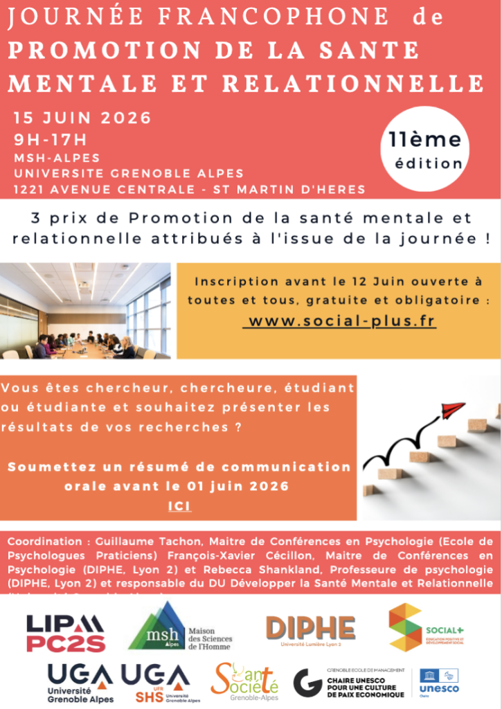 Cette journée est organisée en collaboration avec la MSH-Alpes, l’UFR SHS, le Laboratoire DIPHE (Université Lyon 2), le Laboratoire LIP/PC2S (Université Grenoble Alpes), la Chaire Paix économique, Mindfulness et Bien-être au travail et l’association Social +.