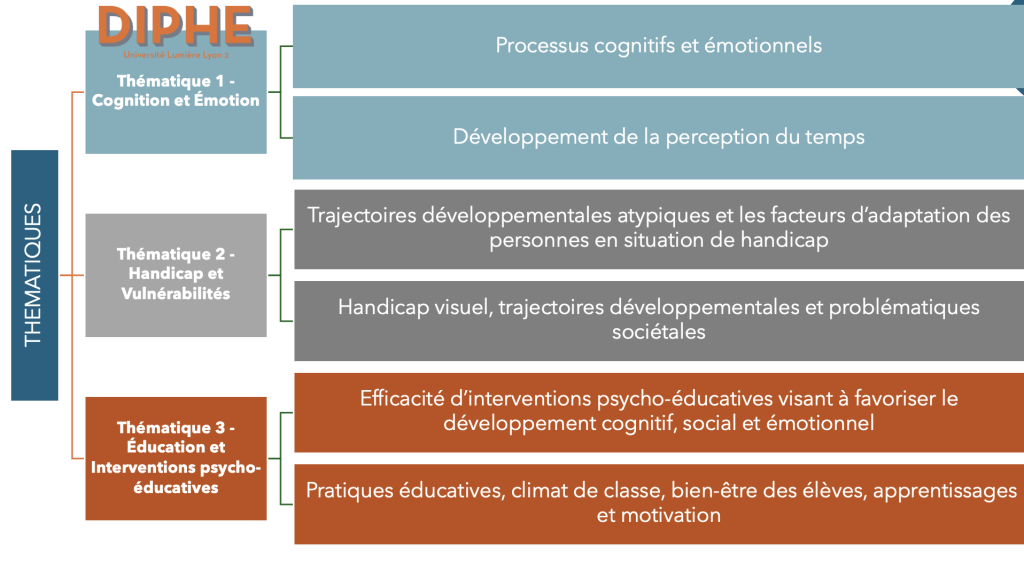 – Thématique 1 – Cognition et Émotion. Cet axe de recherche a pour objectif d’approfondir les processus cognitifs et émotionnels, en reconnaissant leur nature à la fois distincte et interconnectée. Il s’agit d’étudier ces processus dans leurs dimensions individuelles, mais également leurs interactions mutuelles et leur développement au travers des âges.